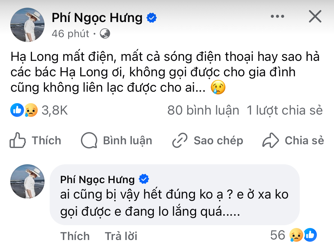 Mới đây nhất, diễn viên Phí Ngọc Hưng hoang mang đăng đàn vì bỗng dưng mất liên lạc với gia đình tại Hạ Long. Nam diễn viên chia sẻ trên trang cá nhân: "Hạ Long mất điện, mất cả sóng điện thoại hay sao hả các bác Hạ Long ơi, không gọi được cho gia đình cũng không liên lạc được cho ai. Ai cũng bị vậy hết đúng không ạ, em ở xa không gọi được em đang lo lắng quá". Nhiều người lập tức trấn an, mong Phí Ngọc Hưng bình tĩnh do Hải Phòng, Quảng Ninh bị mất điện từ chiều, cùng với ảnh hưởng bão nên việc liên lạc sẽ gặp nhiều khó khăn. Đến tầm gần 1 tiếng sau đó, Phí Ngọc Hưng lên tiếng thông báo đã liên lạc được với người thân nên phần nào an tâm hơn.