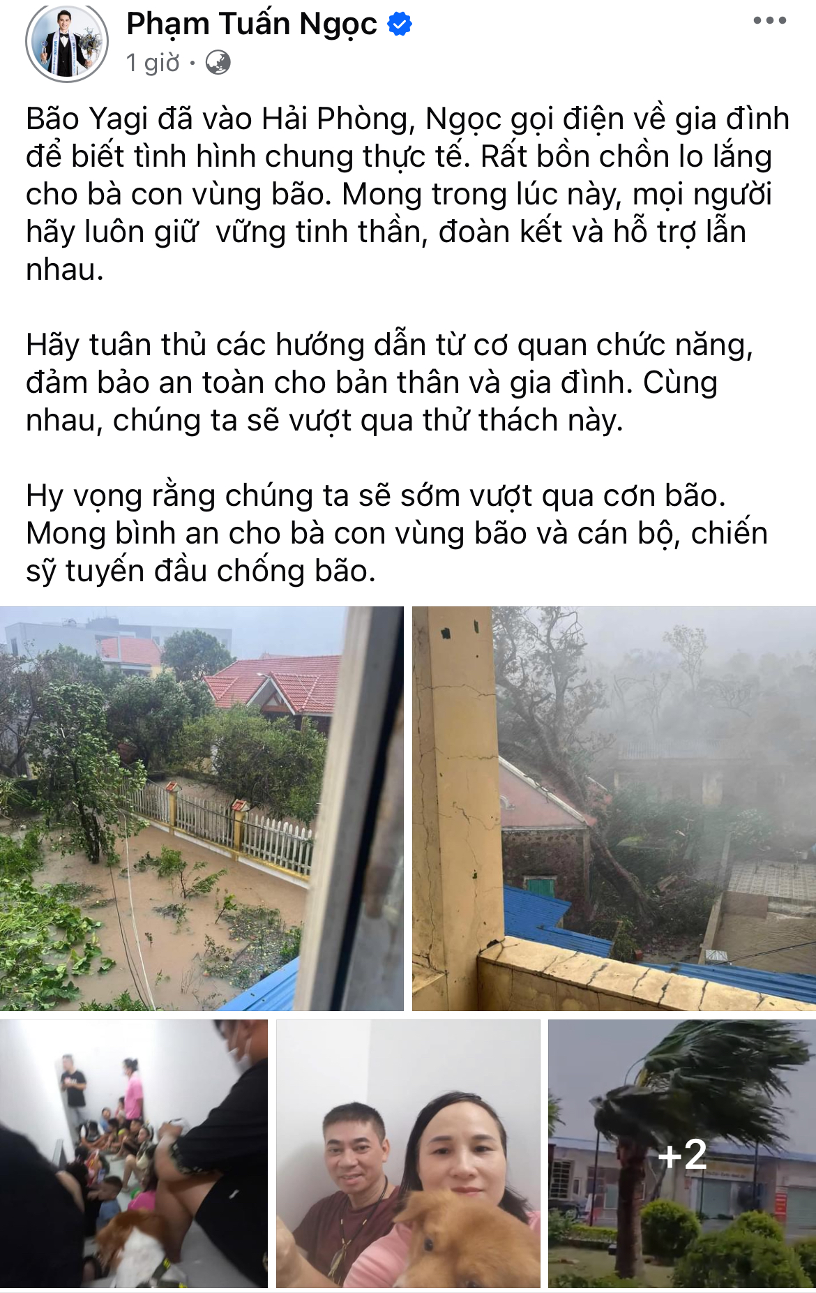 Tuấn Ngọc chia sẻ thêm: "Bão YAGI đã vào Hải Phòng, Ngọc gọi điện về gia đình để biết tình hình chung thực tế. Rất bồn chồn lo lắng cho bà con vùng bão. Mong trong lúc này, mọi người hãy luôn giữ vững tinh thần, đoàn kết và hỗ trợ lẫn nhau. Hãy tuân thủ các hướng dẫn từ cơ quan chức năng, đảm bảo an toàn cho bản thân và gia đình. Cùng nhau, chúng ta sẽ vượt qua thử thách này. Hy vọng rằng chúng ta sẽ sớm vượt qua cơn bão. Mong bình an cho bà con vùng bão và cán bộ, chiến sỹ tuyến đầu chống bão.