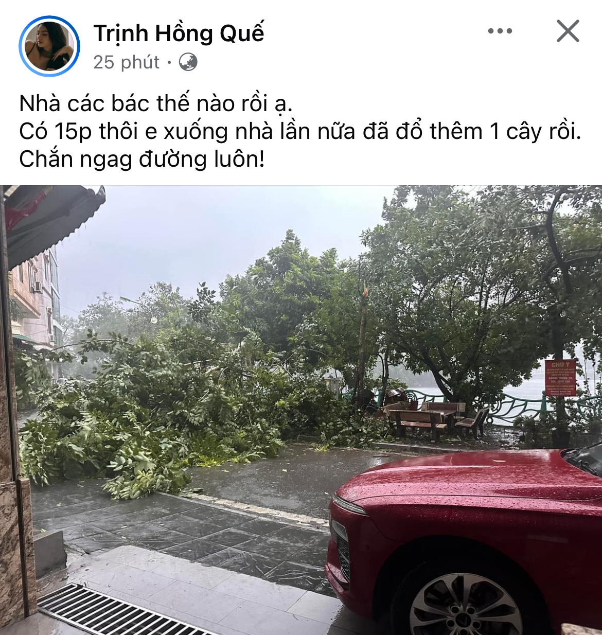 Vào trưa nay, diễn viễn Thanh Bi cũng kêu cứu khi có gia đình sinh sống tại Hạ Long: "Mẹ em kêu cứu rồi, có ai ở đường Hậu Cần Hạ Long không cứu mẹ em với. Nhà em bị bay mái rồi, có ai có số điện thoại cấp cứu chống bão Bãi Cháy không cho em với. Chỉ có một mình mẹ ở nhà".