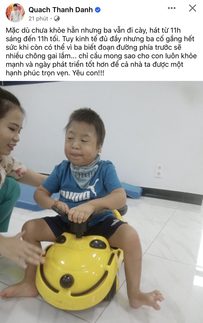 "Mặc dù chưa khỏe hẳn nhưng ba vẫn đi cày, hát từ 11 giờ sáng đến 11 giờ tối. Tuy kinh tế đủ đầy nhưng ba cố gắng hết sức khi còn có thể vì ba biết đoạn đường phía trước sẽ nhiều chông gai lắm... Chỉ cầu mong sao cho con luôn khỏe mạnh và ngày phát triển tốt hơn để cả nhà ta được một hạnh phúc trọn vẹn. Yêu con", anh viết. Dưới phần bình luận, đông đảo khán giả đã bày tỏ niềm cảm thông, động viên tới gia đình Quách Thành Danh.