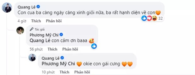 Mới đây, ca sĩ Quang Lê đã công khai để lại bình luận dưới một bài đăng của Phương Mỹ Chi. Nam ca sĩ liên tục dành những lời khen cho nhan sắc và tài năng nữ ca sĩ sinh năm 2003: "Con của ba càng ngày càng xinh giỏi nữa, ba rất hãnh diện về con". Ngoài ra, Quang Lê còn gọi Phương Mỹ Chi là "con gái cưng" thể hiện mối quan hệ cha con thân thiết gắn bó.