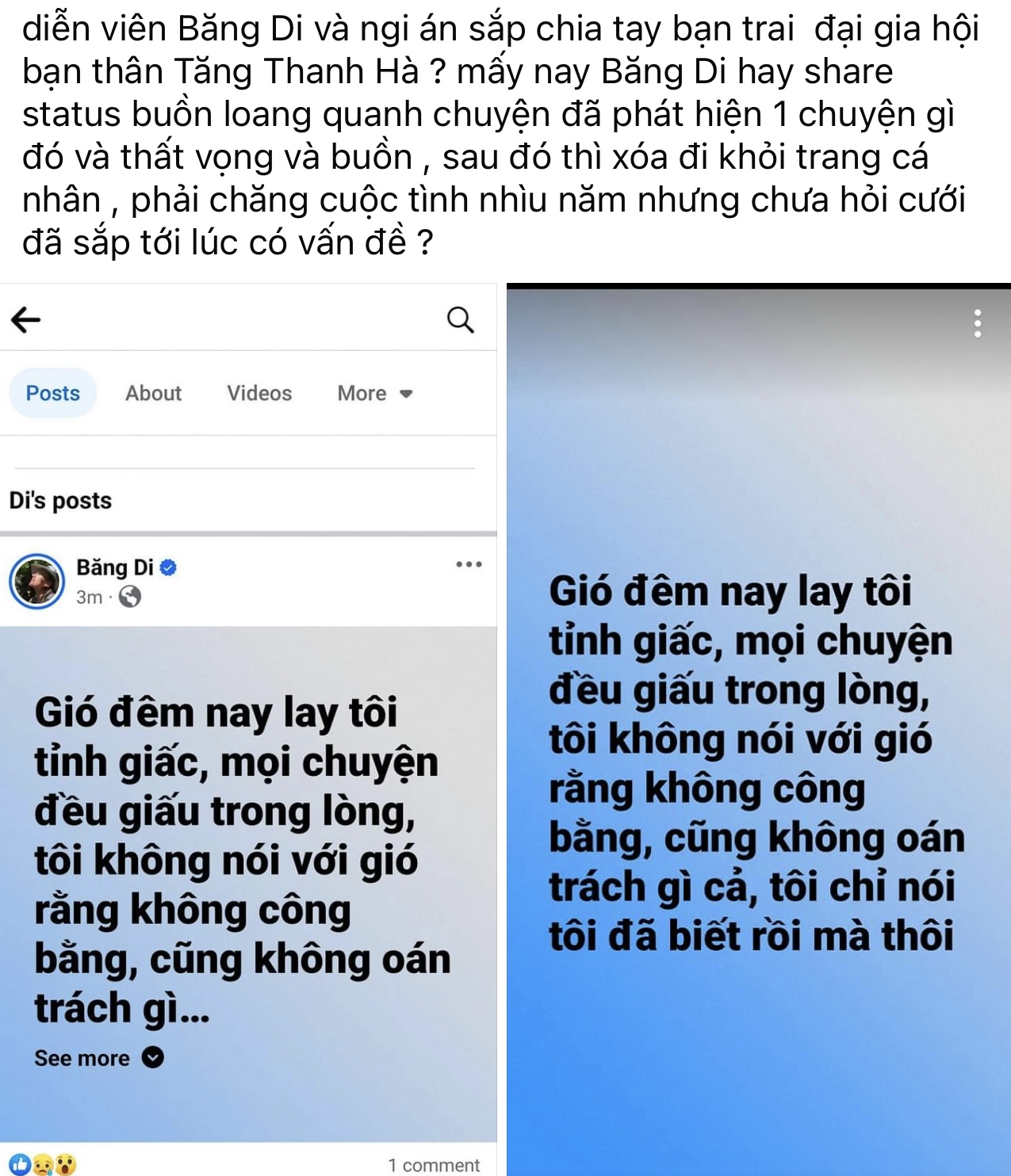 Tuy nhiên mới đây, "thám tử mạng" bất ngờ rộ lên nghi vấn Băng Di và bạn trai Việt kiều đã đường ai nấy đi sau khi gắn bó gần 10 năm. Nguyên do vì trên trang cá nhân, nữ diễn viên sinh năm 1989 hay chia sẻ bài viết tâm trạng: "Gió đêm nay lay tôi tỉnh giấc, mọi chuyện đều giấu trong lòng, tôi không nói với gió rằng không công bằng, cũng không oán trách gì cả, tôi chỉ nói tôi đã biết rồi mà thôi".