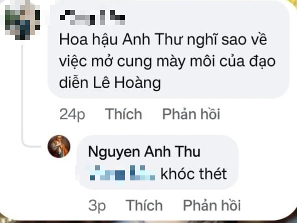 Đáng chú ý, một netizen đã hỏi ý kiến của Anh Thư về chuyện đạo diễn Lê Hoàng đi tân trang lại nhan sắc ở tuổi U70: "Anh Thư nghĩ sao về việc mở cung mày, môi của đạo diễn Lê Hoàng". Siêu mẫu 8x vướng tranh cãi khi bình luận "Khóc thét", nhiều người cho rằng đây là lời nhận xét thiếu tinh tế, kém duyên của cô đối với đàn anh. Hiện tại, bình luận này không còn trên trang cá nhân của Anh Thư.