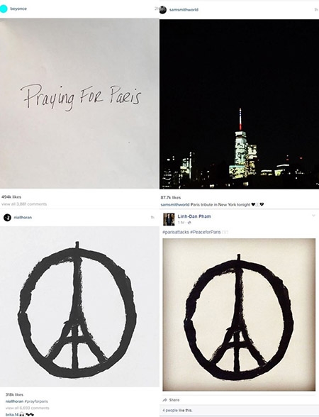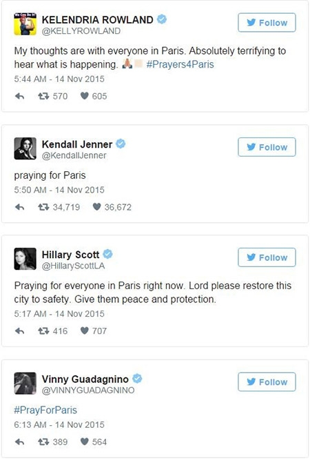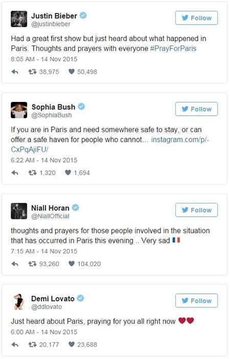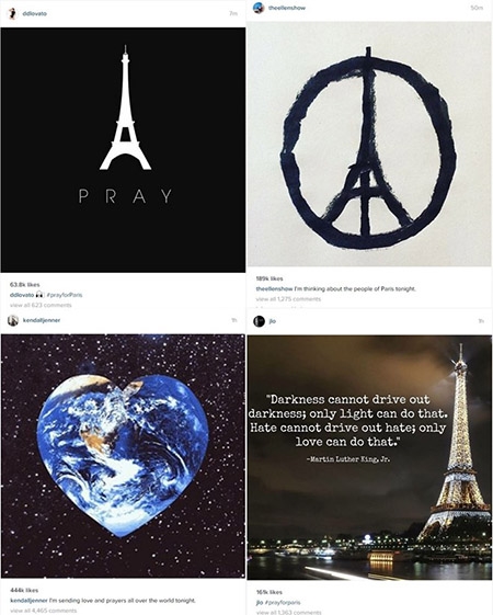 Sự kiện kinh hoàng khiến giới nghệ sĩ trên khắp thế giới bàng hoàng và gửi những lời động viên, chia sẻ tới người dân Pháp với những bức ảnh và dòng hastag #PrayForParis trên Twitter và Instagram.