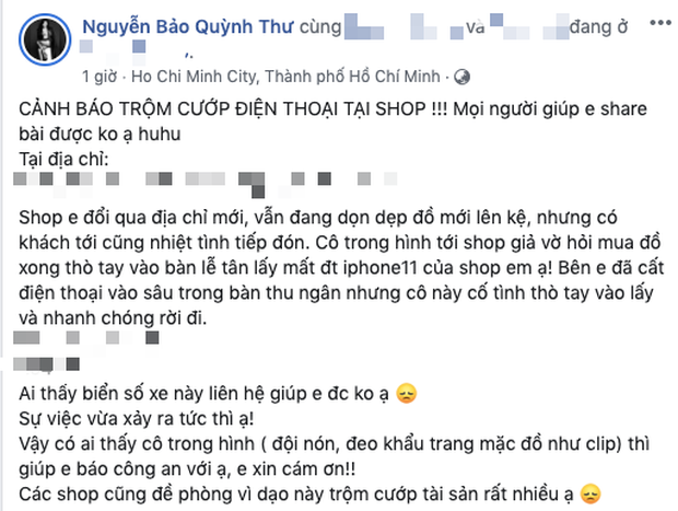 Cách đây ít hôm, Quỳnh Thư gây xôn xao khi thông báo cửa hàng quần áo của mình bị kẻ gian ăn trộm điện thoại bằng chiêu trò tinh vi. "Cảnh báo trộm cướp điện thoại tại cửa hàng. Cửa hàng em đổi qua địa chỉ mới, vẫn đang dọn dẹp đồ mới lên kệ, nhưng có khách tới cũng nhiệt tình tiếp đón. Cô trong hình tới giả vờ hỏi mua đồ xong thò tay vào bàn lễ tân lấy mất điện thoại Iphone 11. Bên em đã cất điện thoại vào sâu trong bàn thu ngân nhưng cô này cố tình thò tay vào lấy và nhanh chóng rời đi". Mặc dù xác định đã mất của, tuy nhiên Quỳnh Thư cũng lên tiếng để cảnh tỉnh mọi người và gửi lời răn đe đến kẻ xấu.