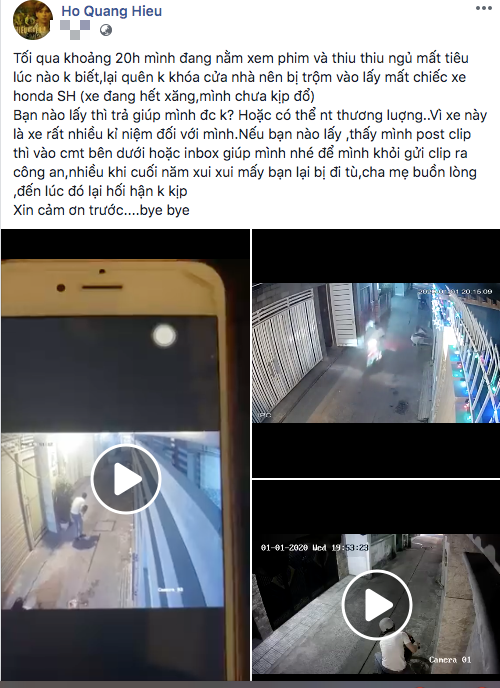 "Tối qua khoảng 20h mình đang nằm xem phim và thiu thiu ngủ mất tiêu lúc nào không biết, lại quên không khóa cửa nhà nên bị trộm vào lấy mất chiếc xe. Bạn nào lấy thì trả giúp mình được không? Hoặc có thể nhắn tin thương lượng. Vì xe này là xe rất nhiều kỉ niệm đối với mình. Nếu bạn nào lấy thì nhắn tin để mình khỏi gửi clip ra công an, nhiều khi cuối năm xui xui mấy bạn lại bị đi tù, cha mẹ buồn lòng, đến lúc đó lại hối hận không kịp. Xin cảm ơn!", anh cho hay. Tuy nhiên, đến hiện tại, sau hơn nửa năm, "kẻ gian" kia vẫn chưa chịu hồi âm, số phận của chiếc xe máy không biết đã đi về đâu.