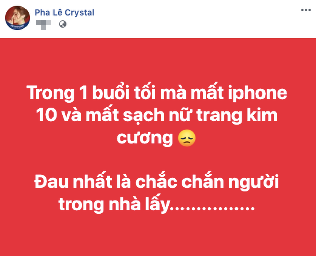 "Đêm qua không thể ngủ được. Chắc kiếp trước mình ăn ở không có đức để kiếp này người nào thân tín nhất đều đến 1 ngày làm phản, đến 1 ngày quậy không còn cái gì. Cũng may là giá trị tài sản không nhiều, vì tính mình thiệt ra không có xài đồ mắc tiền cũng chẳng mấy khi đeo trang sức hay để gì trong nhà nhưng là kỉ niệm, toàn là đồ kỉ niệm của mọi người. Cái buồn nhất là nhà có từng đó người, 100% không ai vào phòng mình ngoại trừ những người quá thân. Ăn ở sao cứ cưu mang người ta rồi người ta mang toàn oán trả lại. Trong nhà còn không tin được rồi sao mà sống?", dòng tâm sự đầy xót xa của Pha Lê.