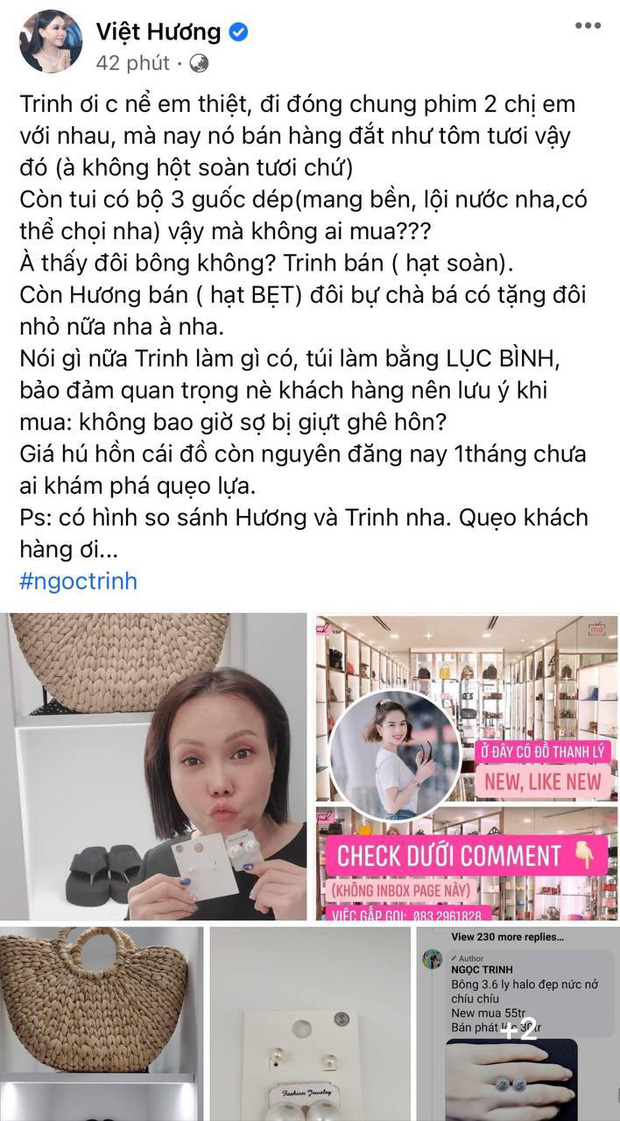 Trên trang cá nhân, NS Việt Hương bày tỏ sự ngưỡng mộ vì "Nữ hoàng nội y" sở hữu nhiều đồ đắt giá, kim cương, túi hiệu giá bạc tỷ: "Trinh ơi, chị nể em thiệt, đi đóng chung phim 2 chị em với nhau, mà nay nó bán hàng đắt như tôm tươi vậy đó, à không hột xoàn tươi chứ".