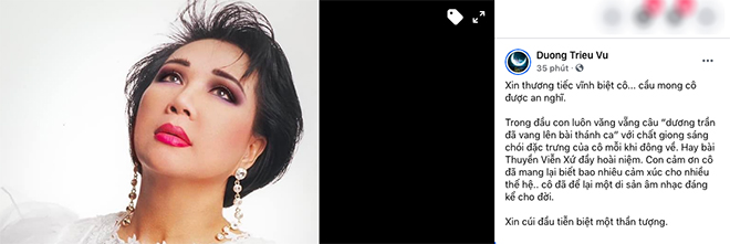 Ca sĩ Dương Triệu Vũ viết: "Xin thương tiếc vĩnh biệt cô. Cầu mong cô được an nghỉ.