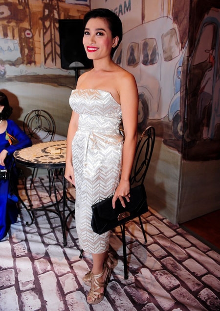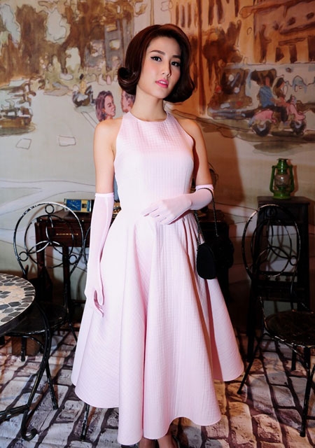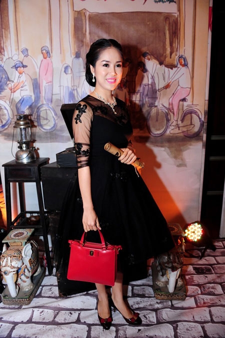 Nữ diễn viên Thanh Thúy diện váy bó cổ điển quý phái, sang trọng với điểm nhấn là nơ cài tóc. |