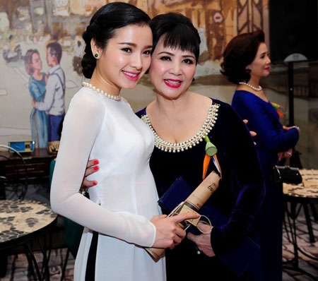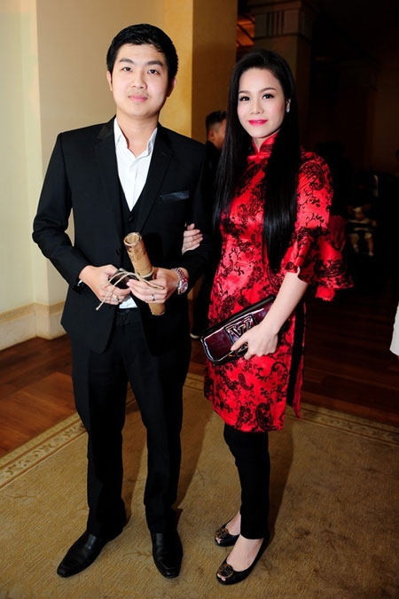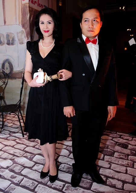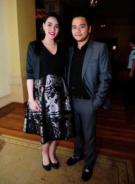 Trang Nhung và ông xã đạo diễn cũng mặc đồng tông đến dự tiệc. Trong chiếc đầm thiết kế, nữ diễn viên trông gọn gàng, thanh thoát dù mang bầu gần 8 tháng. Ngân Khánh là bạn thân với vợ chồng Trang Nhung. |