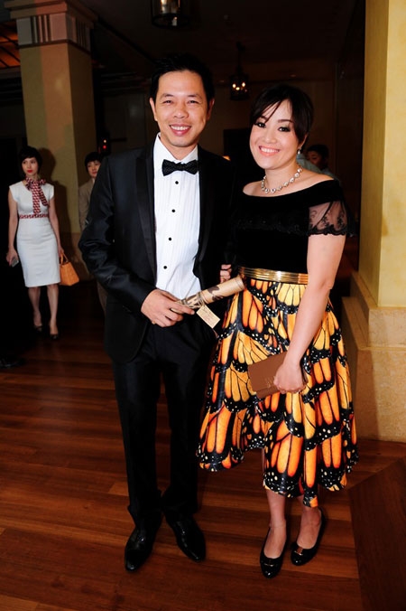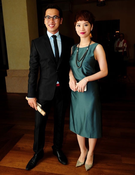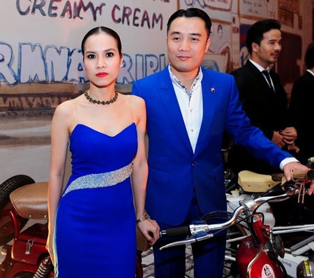 Ông vua phòng vé Thái Hòa cùng bà xã đến khá muộn. Anh và cô dâu vừa hợp tác xong bộ phim Ma Dai do chồngTrang Nhung làm đạo diễn và vợ chồng Thanh Thúy làm sản xuất. Bộ phim dự kiến công chiếu vào tháng 4/2015 |
