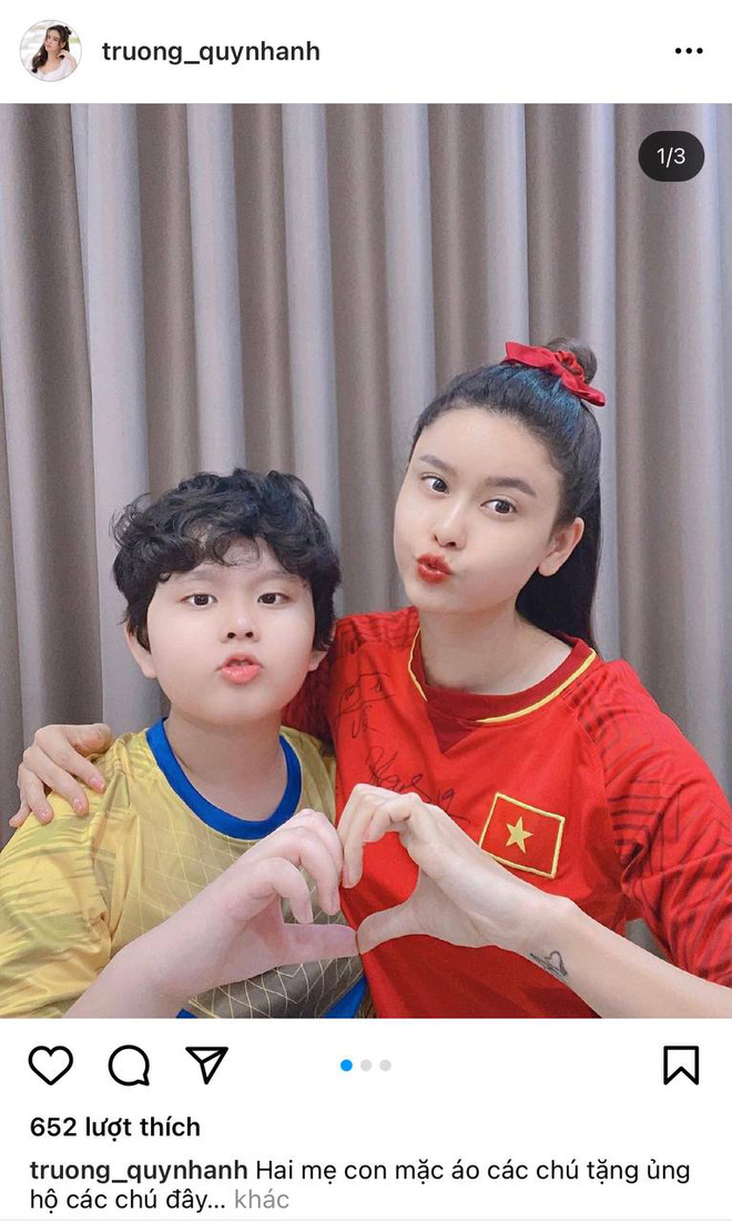 Mẹ con Trương Quỳnh Anh mặc áo bóng đá và gửi lời chúc may mắn tới các cầu thủ Việt Nam