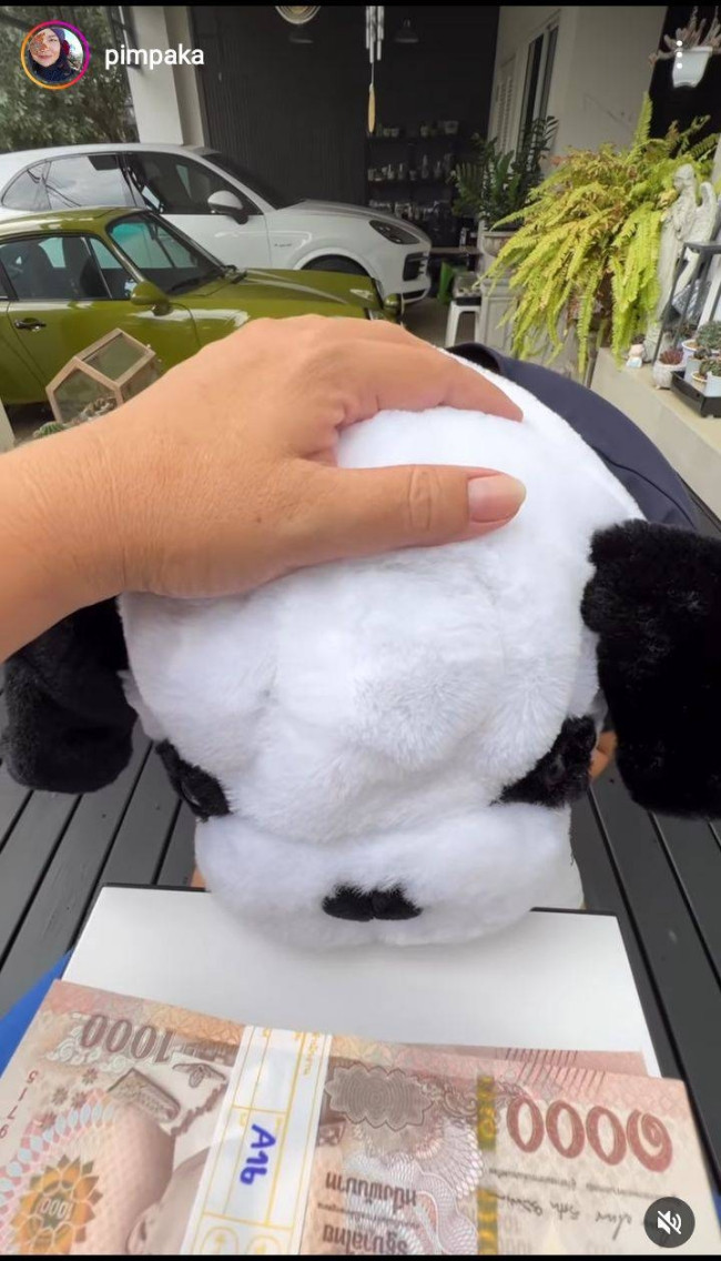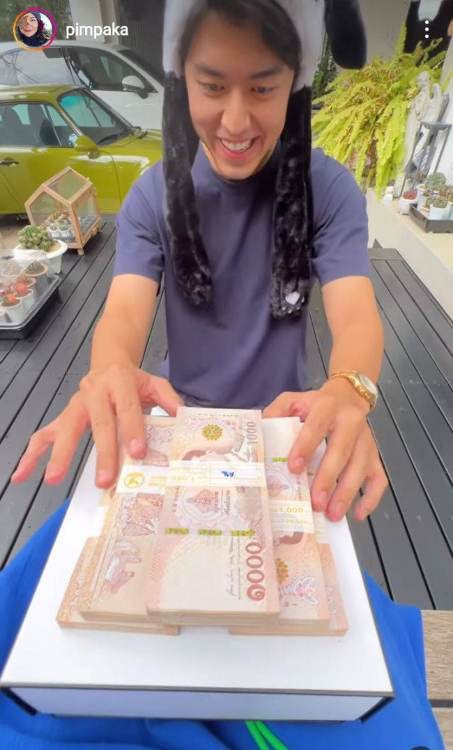 Phía dưới chiếc khăn là 5 xấp tiền có tổng giá trị 500 nghìn baht (khoảng 347 triệu đồng). Mẹ của nam diễn viên hỏi số tiền này từ đâu ra, câu trả lời là lấy từ két sắt của mẹ. Hai mẹ con sau đó cười phá lên.
