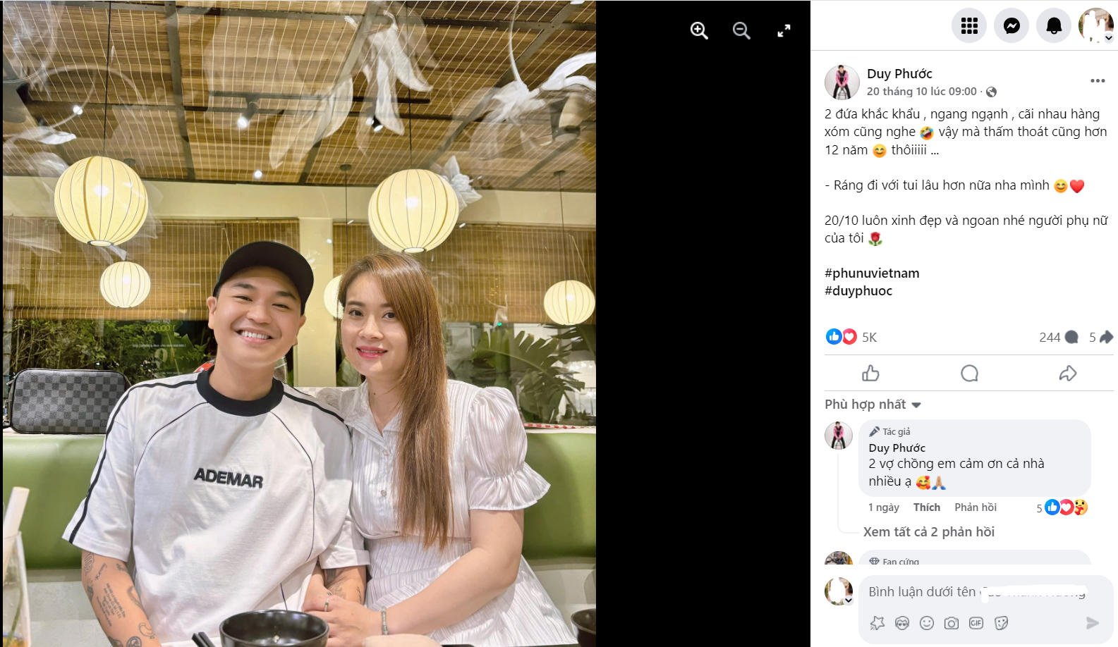 Mới đây, Duy Phước chia sẻ trên trang cá nhân hình ảnh tình tứ với vợ hơn 8 tuổi. Cùng với hình ảnh này, Duy Phước viết: “Hai đứa khắc khẩu, ngang ngạnh, cãi nhau hàng xóm cũng nghe. Vậy mà thấm thoát cũng hơn 12 năm thôi. Ráng đi với tui lâu hơn nữa nha mình”.