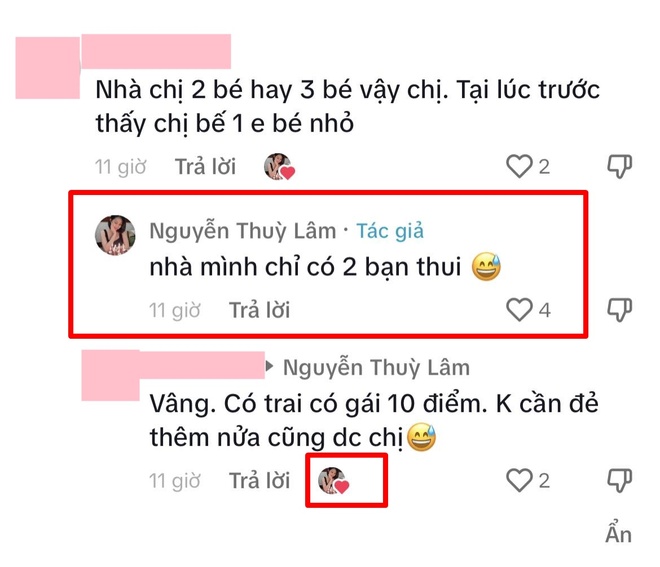 Cho đến mới đây, Hoa hậu Thùy Lâm đã lên tiếng làm rõ vấn đề này. Theo đó, cô chia sẻ vlog cùng chồng và 2 con tên Su và Mon cùng đi du lịch Thái Lan. Bên dưới bình luận, một cư dân mạng đã hỏi thẳng Thùy Lâm về tin đồn cô bí mật sinh con thứ 3. Ngay lập tức, mẹ bỉm khẳng định cô và chồng tiến sĩ hiện chỉ có 2 nhóc tỳ. Ngoài ra, Thùy Lâm còn "thả tim" một mình luận cho rằng gia đình cô đã rất trọn vẹn, không cần sinh thêm con nữa. Như vậy, sau 2 năm "bán tín bán nghi", cuối cùng cư dân mạng cũng đã có câu trả lời cho nghi vấn Thùy Lâm làm mẹ bỉm 3 con.
