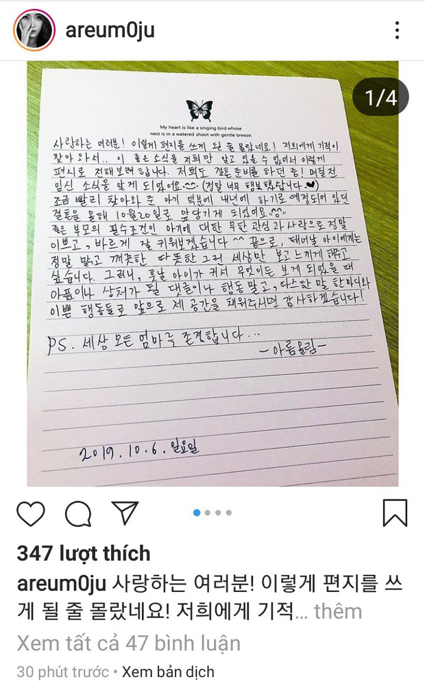 Sau đó, thông qua một bài đăng trên Instagram cá nhân, Ahreum cũng đăng tải bức tâm thư thông báo tin mang thai và mong muốn người hâm mộ gửi nhiều tình yêu thương và cổ vũ cho gia đình nhỏ của cô.
