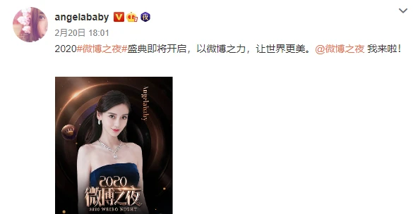 Trùng hợp thay, ngày hôm đó (28/02) cũng chính là sinh nhật của Angelababy. Fan hâm mộ cô nàng cảm thấy rất vui vì được trực tiếp ngắm nhìn thần tượng của mình xuất hiện xinh đẹp, lộng lẫy trong dịp đặc biệt như thế. Angelababy cũng đã đăng bài xác nhận mình sẽ tham dự Đêm hội Weibo 2020.