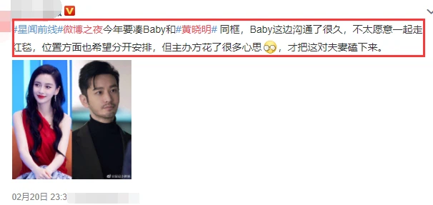 Sự kiện Đêm hội Weibo 2020 được tổ chức vào ngày 28/02 sắp tới, hiện tại dàn khách mời đã xác nhận sẽ tham gia gồm có Triệu Lệ Dĩnh, Dương Tử, Vương Nhất Bác, Hoa Thần Vũ, nhóm THE9, Trương Nghệ Hưng, Thái Từ Khôn... Có tin tức cho biết cả hai vợ chồng Angelababy và Huỳnh Hiểu Minh sẽ cùng xuất hiện tại sự kiện lần này.