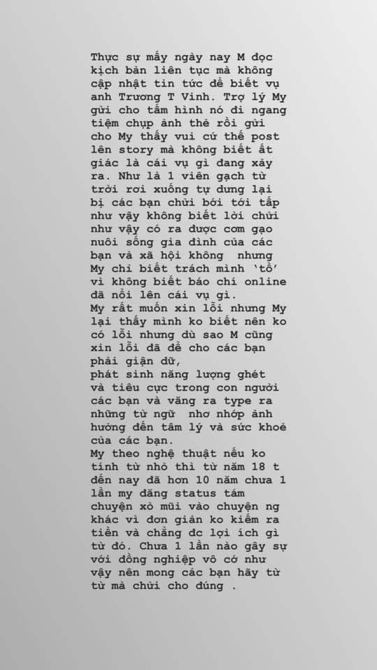 Diễm My khẳng định bản thân không biết nên không có lỗi nhưng cô vẫn gửi lời xin lỗi đến khán giả - những người đã sản sinh năng lượng tiêu cực vì tranh cãi này. Nữ diễn viên chia sẻ, cô gia nhập nghệ thuật từ nhỏ, chưa bao giờ can thiệp hay "xỏ mũi" vào chuyện của người khác nên lần này cũng không phải ngoại lệ.
