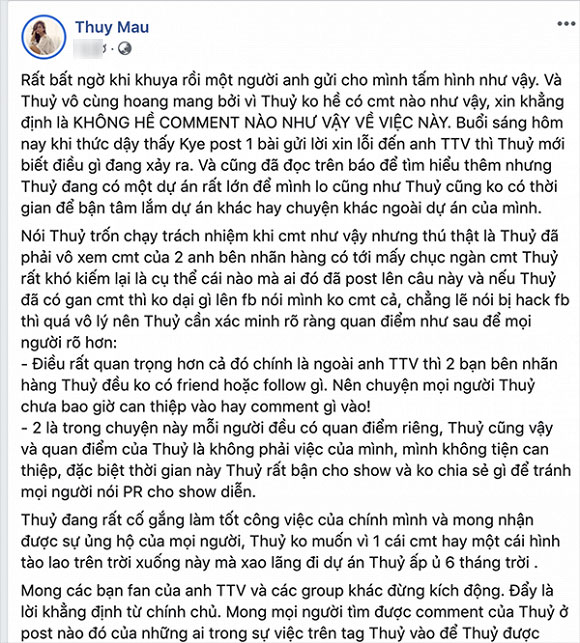 "Rất bất ngờ khi khuya rồi một người anh gửi cho mình tấm hình như vậy. Và Thuỷ vô cùng hoang mang bởi vì Thuỷ không hề có comment nào như vậy, xin khẳng định là KHÔNG HỀ COMMENT NÀO NHƯ VẬY VỀ VIỆC NÀY. Buổi sáng hôm nay khi thức dậy thấy Kye post 1 bài gửi lời xin lỗi đến anh TTV thì Thuỷ mới biết điều gì đang xảy ra. Và cũng đã đọc trên báo để tìm hiểu thêm nhưng Thuỷ đang có một dự án rất lớn để mình lo cũng như Thuỷ cũng không có thời gian để bận tâm lắm dự án khác hay chuyện khác ngoài dự án của mình.