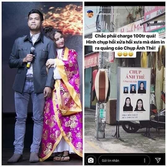 Cụ thể, Diễm My đã đăng tải hình chụp lại tấm biển sử dụng hình ảnh của cô trước cửa một tiệm chụp ảnh với dòng chú thích: "Chắc phải charge 100 triệu quá. Hình chụp hồi xửa hồi xưa mà dám in ra quảng cáo chụp ảnh thẻ".