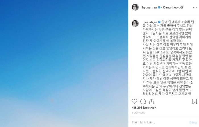 Trong bức tâm thư dài được đăng kèm theo bức hình chụp bầu trời, HyunA tiết lộ mình đang phải đối mặt với chứng rối loạn hoảng sợ và ngất do vasovagal (một chứng ngất do thần kinh phế vị).