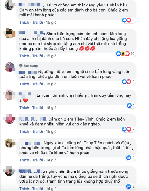 Hành động đẹp cùng tấm lòng nhân hậu của vợ chồng Công Vinh - Thủy Tiên một lần nữa ghi điểm tuyệt đối trong mắt khán giả. Vô số bình luận ủng hộ và tán dương đã được để lại ngay dưới bài viết: "Trời ơi! Cảm ơn anh chị có mặt trên cuộc đời này! Cảm ơn tấm lòng Bồ tát của hai vị giữa đời thường! Trân quý và biết ơn thật nhiều! Mình mừng thay cho bà con, ai làm gì làm mình cứ hành thiện cứ cho đi, cứ sống tốt vạn sự tốt đẹp sẽ tới với mình, nghiệp chướng sẽ tiêu tan", "Càng ngày mình càng ngưỡng mộ Thủy Tiên Công Vinh có tấm lòng vàng. Chúc gia đình Tiên - Vinh thật nhiều sức khỏe, hạnh phúc và thành công hơn trong cuộc sống", "Hai vợ chồng em thật đáng yêu và nhân hậu. Cảm ơn tấm lòng của các em dành cho bà con. Chúc 2 em mãi mãi hạnh phúc", "Đúng là cặp đôi hoàn hảo đã đẹp hình thức lại còn đẹp cả tâm hồn. Mong bạn nhiều sức khỏe thành công để giúp được nhiều mảnh đời khó khăn và bất hạnh", "Hình như cô ấy sinh ra để nghĩ và làm từ thiện. Thật tuyệt vời. Ngưỡng mộ quá",...
