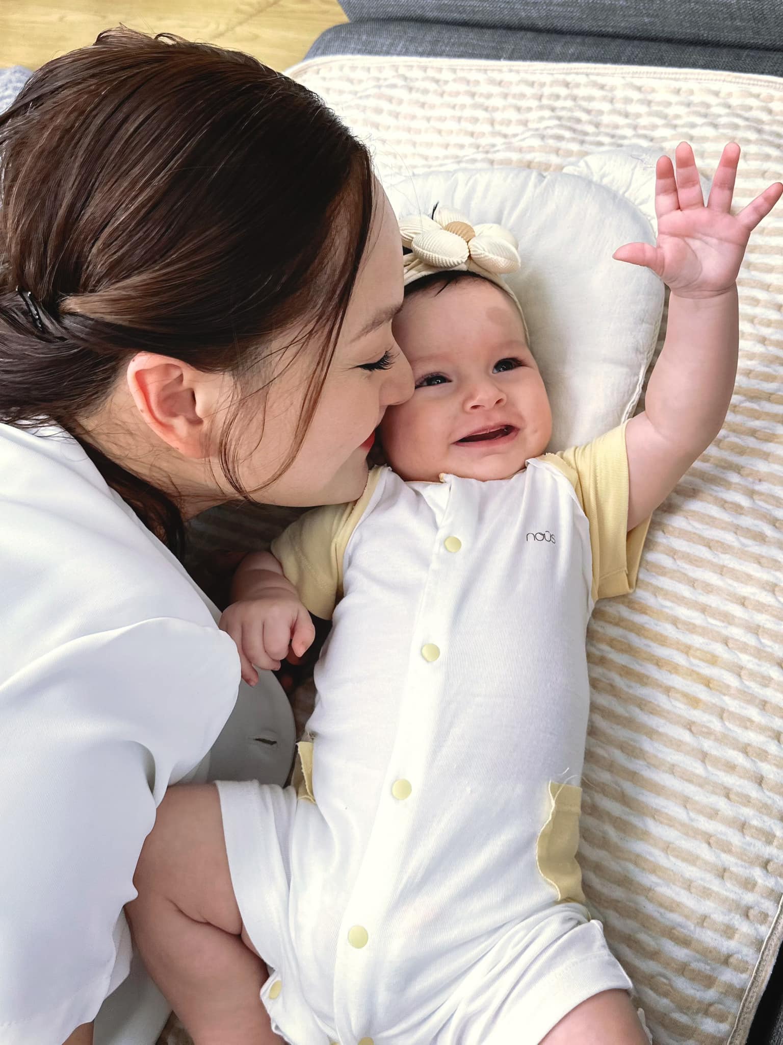 16h: Cho Mia bú, chơi với Mia, Mia cười rất nhiều, Mia nâng đầu, tóm tay mẹ ngồi dậy. Nụ cười Mia làm mẹ bớt bao nhiêu mệt mỏi.