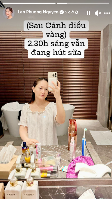 Mới đây, nữ diễn viên chia sẻ khoảnh khắc của bản thân vào lúc gần 3h sáng với dòng chia sẻ: "Sau buổi lễ, vẫn đang hút sữa". Lúc này Lan Phương đã skincare, để lộ mặt mộc khá bơ phờ sau một ngày dài làm việc. Dù bận rộn đến mấy, nhiệm vụ hút sữa cũng luôn được cô ưu tiên hoàn thành, vừa để duy trì sữa mẹ, vừa có đủ lượng sữa dự trữ cho con ăn.