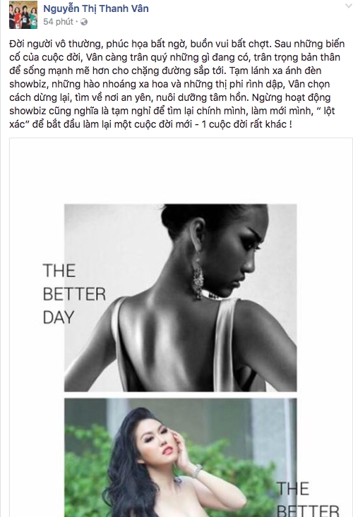 Phi Thanh Vân ngừng hoạt động showbiz là tạm nghỉ để tìm lại chính mình, làm mới bản thân. Cô muốn "lột xác" để bắt đầu làm lại một cuộc đời mới.