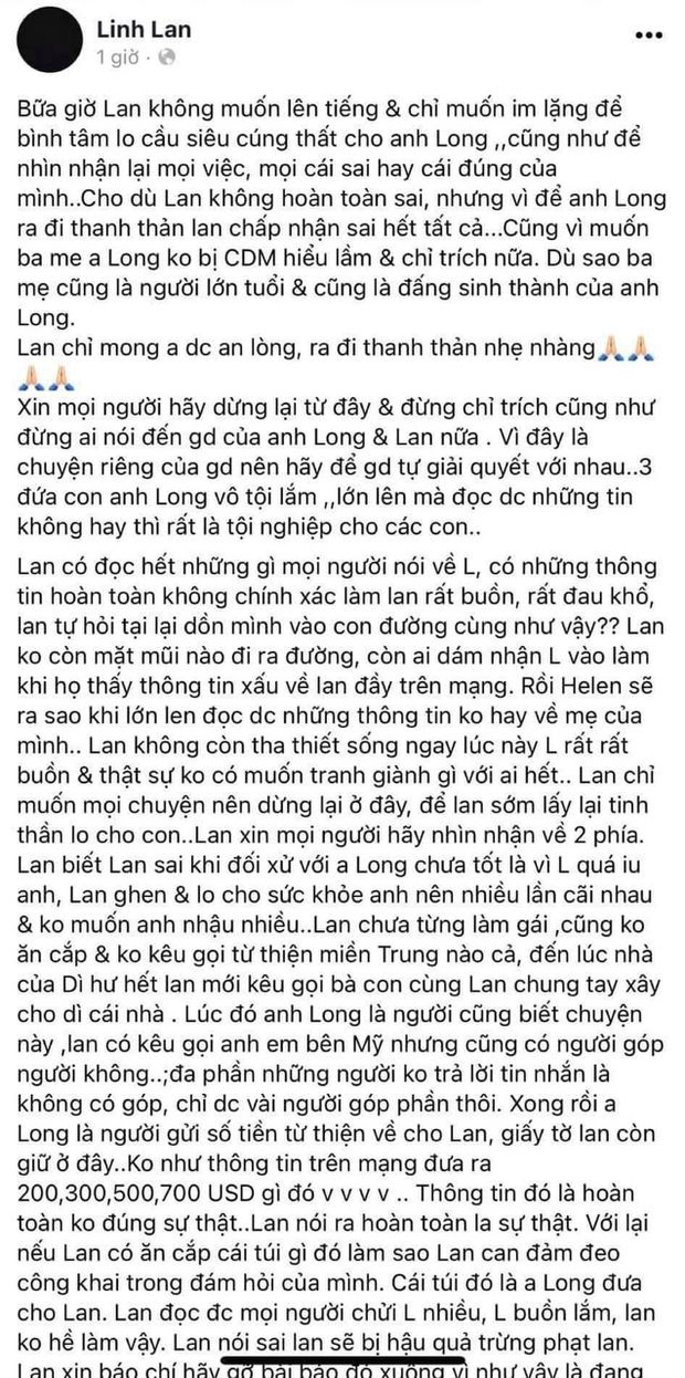 Lan chỉ mong anh được an lòng, ra đi thanh thản nhẹ nhàng. Xin mọi người hãy dừng lại từ đây và đừng chỉ trích cũng như đừng ai nói đến gd của anh Long và Lan nữa. Vì đây là chuyện riêng của gia đình nên hãy để gia đình tự giải quyết với nhau. 3 đứa con anh Long vô tội lắm, lớn lên mà đọc được những tin không hay thì rất là tội nghiệp cho các con.