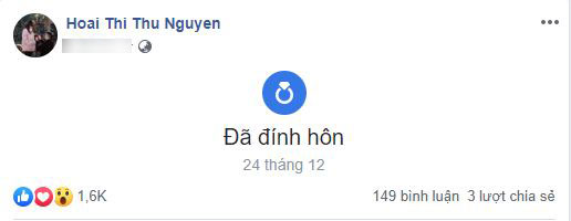 Mới đây, Hoa hậu Thu Hoài bất ngờ đổi ảnh đại diện của mình sang một bức ảnh ghi lại khoảnh khắc cô được bạn trai kém 10 tuổi quỳ gối cầu hôn khiến nhiều người bất ngờ. Cùng với đó, người đẹp sinh năm 1976 cũng thay đổi trạng thái sang "đã đính hôn" để ghi dấu sự kiện quan trọng này.