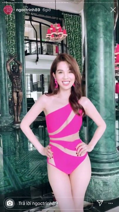 Ngay trước đó, Ngọc Trinh cũng "gây sốt" khi đăng tải đoạn clip hậu trường buổi chụp hình bikini tại hồ bơi. Diện thiết kế bikini 2 mảnh màu nỏ "bốc lửa" và những đường cắt táo bạo, đặc biệt khoe chân ngực gợi cảm đến nghẹt thở, Ngọc Trinh thu về hàng trăm nghìn lượt xem của cộng đồng mạng.