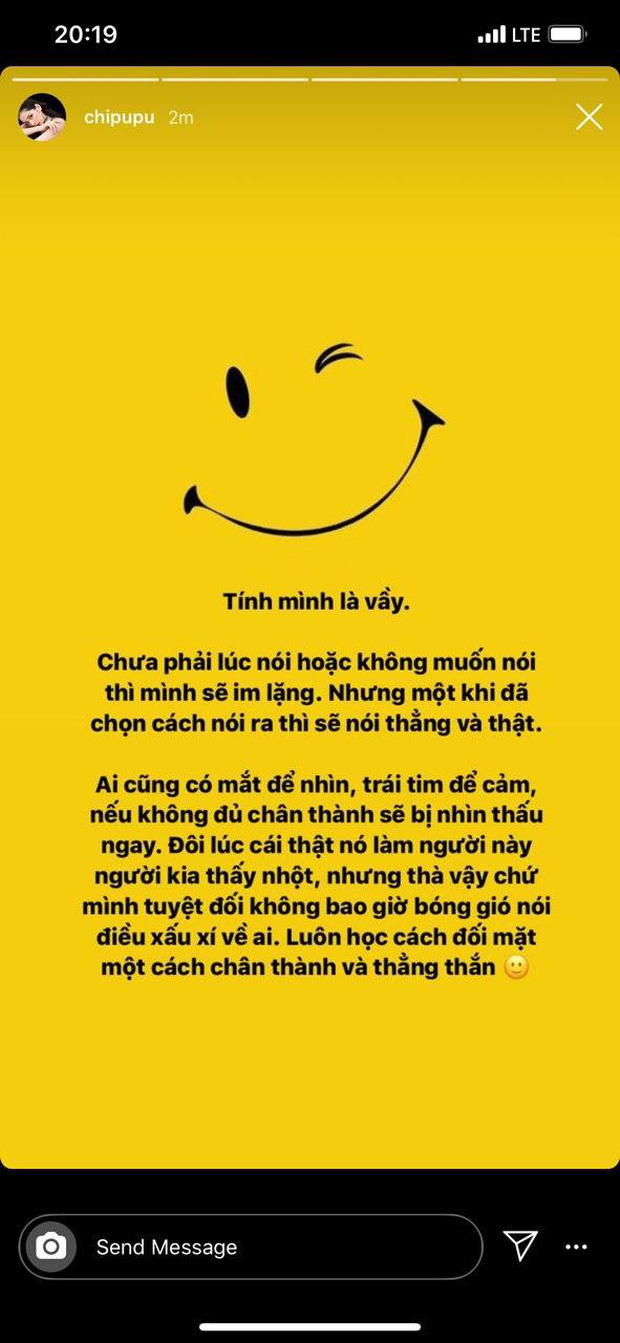 Không rõ có phải đã thấy được bài đăng của Gil Lê hay không mà cách đây ít giờ, Chi Pu cũng có động thái mới trên trang cá nhân. Cô viết: "Tính mình là vầy. Chưa phải lúc nói hoặc không muốn nói thì mình sẽ im lặng. Nhưng một khi đã chọn cách nói ra thì sẽ nói thẳng và thật. Ai cũng có mắt để nhìn, trái tim để cảm, nếu không đủ chân thành sẽ bị nhìn thấu ngay. Đôi lúc cái thật nó làm người này người kia thấy nhột, nhưng thà vậy chứ mình tuyệt đối không bao giờ bóng gió nói điều xấu xí về ai. Luôn học cách đối mặt một cách chân thành và thẳng thắn".