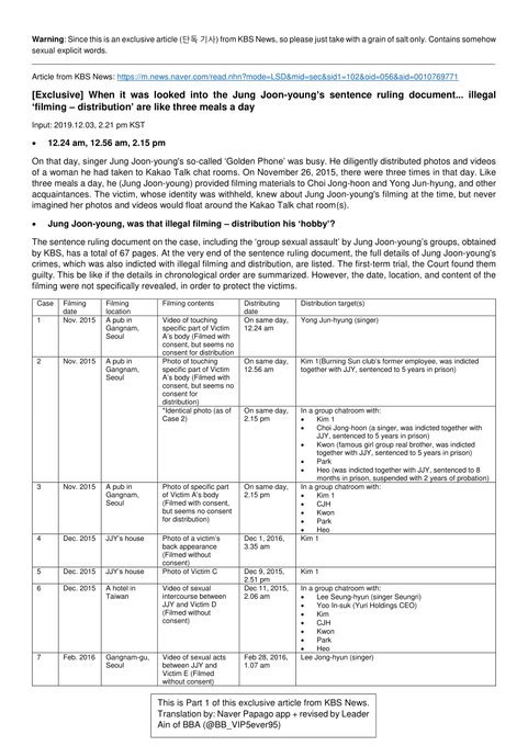 Trong tập tài liệu mà KBS chia sẻ, công chúng bàng hoàng vì chứa chi tiết thời gian, địa điểm gửi tin nhắn và số lượng người liên quan. Cụ thể, Jung Joon Young đã phát tán video đồi trụy đến 14 người qua 5 phòng chat, trong đó có 3 phòng chat kín và 2 phòng chat cá nhân 1:1. Nhà đài cũng xác nhận có ít nhất 10 người trở thành nạn nhân của Jung Joon Young, trong đó có 2 cô gái là người ngoại quốc.