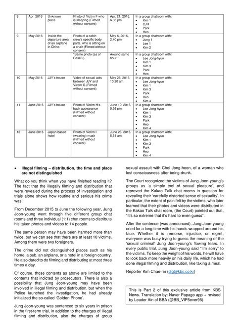 Ngày 3/12, KBS quyết định tung những thông tin quan trọng lên mặt báo khiến công chúng không khỏi rùng mình vì độ bệnh hoạn của Jung Joon Young và đồng bọn. KBS so sánh tần suất phán tán video bất hợp pháp của Jung Joon Young tới bạn bè đều đặn như "ăn cơm 3 bữa một ngày". Một nạn nhân chưa rõ danh tính biết rằng Jung Joon Young đang quay lại cảnh nhạy cảm của mình nhưng không thể tưởng tượng được rằng những hình ảnh và clip đó sẽ trôi nổi trên phòng chat Kakao Talk.
