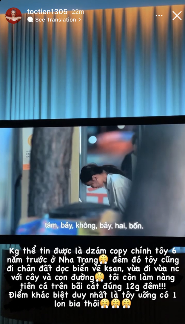 Sau khi quan điểm nhận về loạt ý kiến trái chiều, tối 11/10, Tóc Tiên đã có động thái đầu tiên trên Instagram cá nhân. Nữ ca sĩ Ngày Mai vẫn đang thư giãn, vui vẻ thoải mái xem phim Hàn Quốc tại gia. Bà xã Hoàng Touliver còn hài hước so sánh bản thân với nữ chính trong phim: "Vừa đi vừa nói chuyện với cây và con đường. Tôi còn làm nàng tiên cá trên bãi cát đúng 12 giờ đêm". Sau khi khoá Facebook, Tóc Tiên vẫn đang tận hưởng cuộc sống riêng của mình.