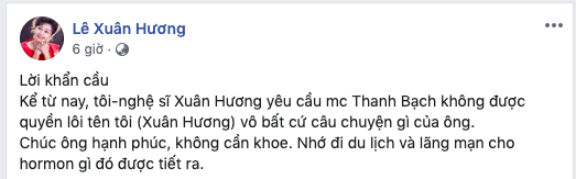 NS Xuân Hương cho hay: "Lời khẩn cầu. Kể từ nay, tôi - nghệ sĩ Xuân Hương yêu cầu MC Thanh Bạch không được quyền lôi tên tôi (Xuân Hương) vô bất cứ câu chuyện gì của ông.
