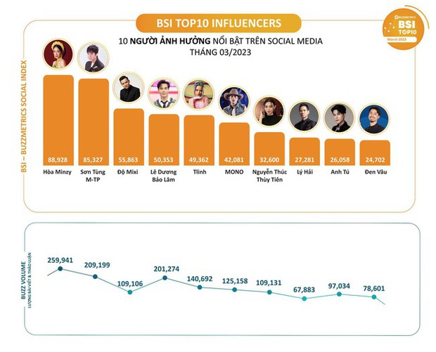 Mới đây, trên trang của Buzzmetrics đã công bố danh sách 10 nhân vật có sức ảnh hưởng nhất trên MXH tháng 3/2023. Nhờ thành công của MV Thị Mầu gây sốt khắp các nền tảng MXH, Hòa Minzy đã trở thành cái tên dẫn đầu trong danh sách. Những gương mặt theo sau lần lượt là Sơn Tùng, Độ Mixi, Lê Dương Bảo Lâm...