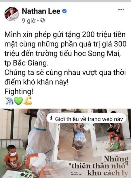 Ca sĩ Nathan Lee sau những ngày "gây sốc" vì liên tục "bóc phốt" nghệ sĩ trên trang Facebook cá nhân đã chuyển hướng sang "gây bão" bằng kế hoạch thiện nguyện dành cho trẻ em đang sống trong các khu cách ly.