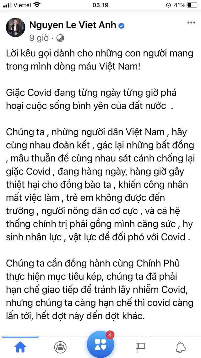 Diễn viên Việt Anh ngày hôm qua cũng đã đăng dòng trạng thái dài trước những tranh luận về cách làm thiện nguyện hiện nay. Qua đó, anh kêu gọi mọi người đoàn kết, gác lại những bất đồng, mâu thuẫn để sát cánh cùng Chính phủ và người dân chống "giặc" COVID-19. Theo anh, đây mới là điều để tất cả mọi người cần lưu tâm lúc này bởi "nó đang hàng ngày, hàng giờ gây thiệt hại cho đồng bào ta, khiến công nhân mất việc làm, trẻ em không được đến trường, người nông dân cơ cực và cả hệ thống chính trị phải gồng mình căng sức, hi sinh nhân lực, vật lực để đối phó với COVID-19. Chúng ta cần đồng hành cùng Chính phủ thực hiện mục tiêu kép… Hễ là người dân Việt Nam thì phải đứng lên đánh "giặc" COVID-19, giữ lấy sức khỏe cho chính chúng ta. Ai có gì thì đóng góp cái đó, linh hoạt trong các phương pháp đóng góp. Trẻ em có thể đóng góp bằng bữa ăn sáng, người lớn thì có thể đóng góp bằng 1 ngày công lao động".