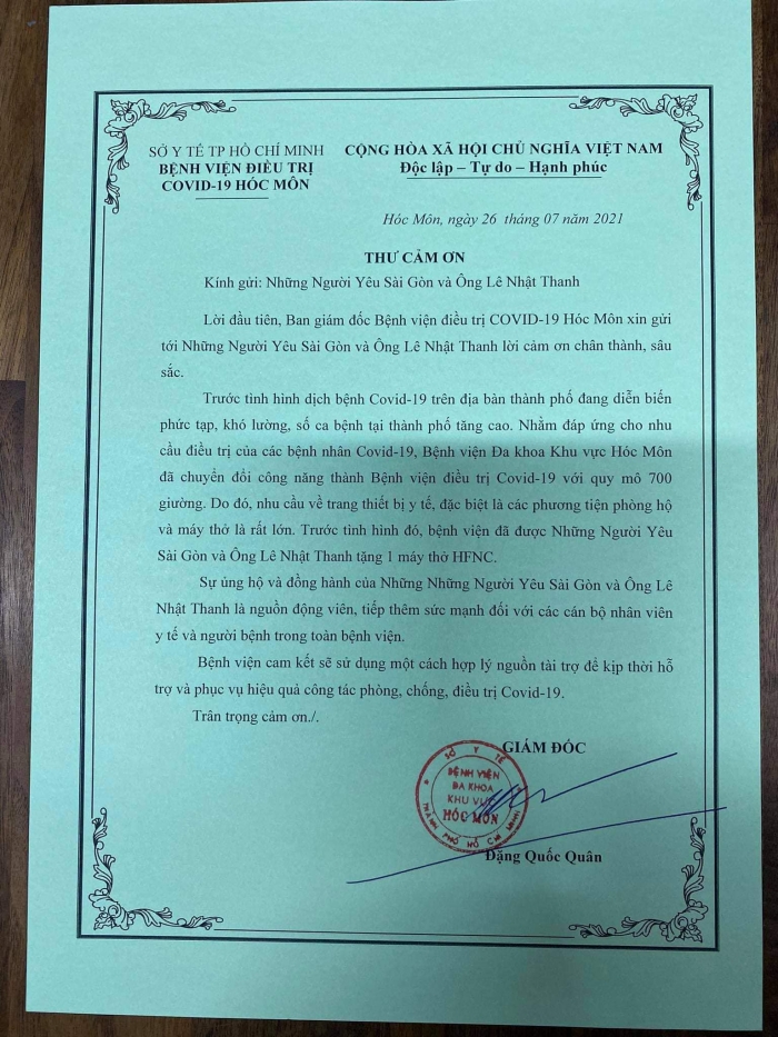 Ngày 28/7, trên trang cá nhân, Phi Nhung vừa bất ngờ đăng bài thông báo đã vận động được 4 chiếc máy thở của Mỹ để hỗ trợ bệnh nhân mắc Covid-19, kèm theo đó là lời kêu gọi khán giả cùng chung tay đóng góp để cùng các y bác sĩ và người dân nhiễm bệnh vượt qua khó khăn. Bất chấp những ồn ào về đời tư những ngày vừa qua, giọng ca "Lấy chồng xứ lạ" tuyên bố cô sẵn sàng bị chửi, bị nghĩ xấu khi đứng ra kêu gọi mua máy thở, chỉ cần bà con bị bệnh có cơ hội được sống.
