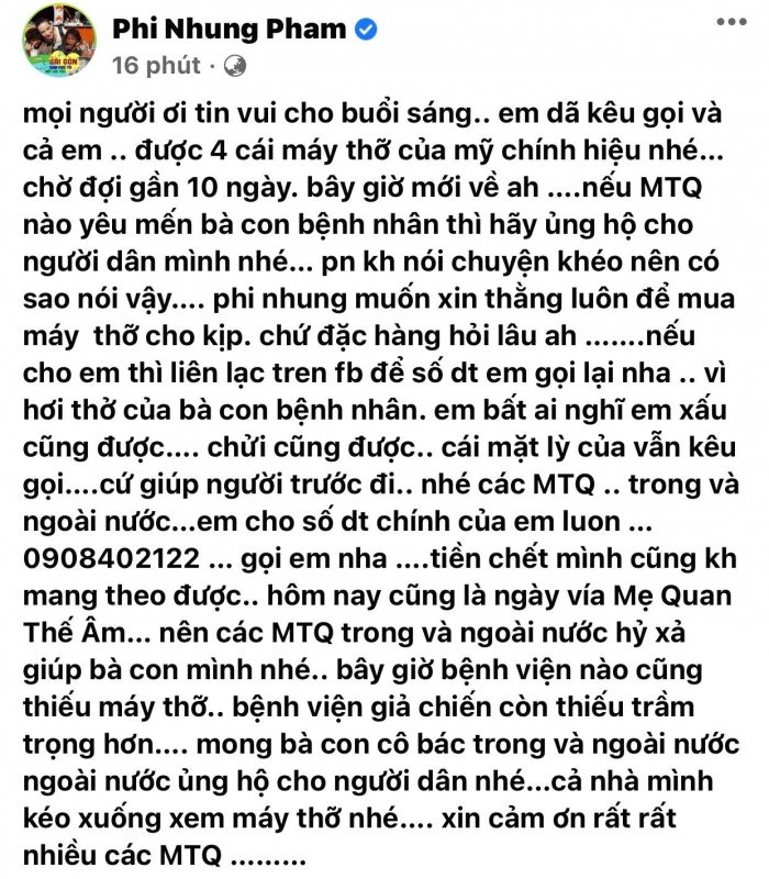 Hôm nay cũng là ngày vía Mẹ Quan thế âm nên các MTQ trong và ngoài nước hoan hỷ giúp bà con mình nhé. Bây giờ bệnh viện nào cũng thiếu máy thở, bệnh viện dã chiến còn thiếu trầm trọng hơn mong bà con cô bác trong và ngoài nước ủng hộ cho người dân nhé. Cả nhà mình kéo xuống xem máy thở nhé. Xin cảm ơn rất rất nhiều các MTQ", Phi Nhung viết.