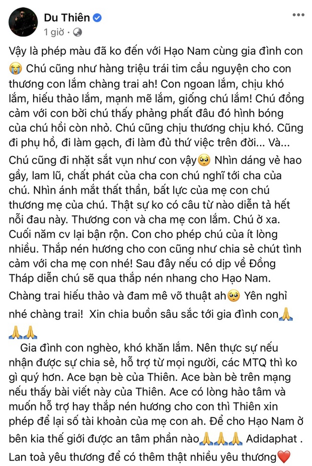 Trước đó, Du Thiên đã gây tranh cãi khi tuyến bố sẽ giúp đỡ gia đình nhưng đi kèm với điều kiện bé Hạo Nam còn sống: "Thương con, nếu con trở về an toàn. Của ít lòng nhiều. Chú cũng xin phép sẽ tài trợ một chiếc xe đạp điện và hỗ trợ toàn bộ chi phí cho con theo đuổi đam mê học võ. Tới khi con đủ 18 tuổi chú sẽ tặng con một chiếc xe máy. Cầu mong phép màu sẽ đến với con. Trong trường hợp xấu nhất thì chú cũng xin phép hỗ trợ gia đình một khoản nho nhỏ. Chúng ta hãy cùng cầu nguyện điều kì diệu sẽ đến với con".