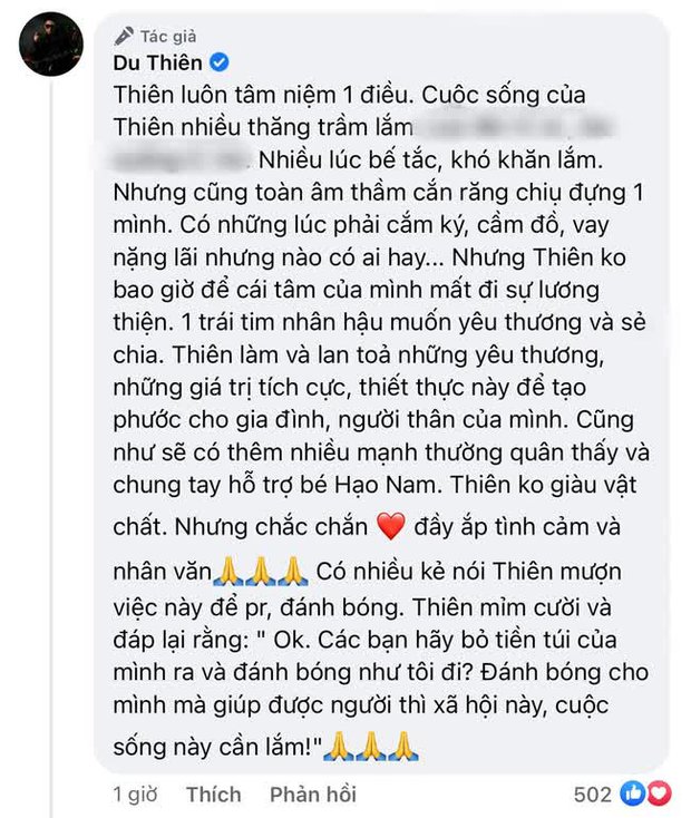 Ngoài ra, Du Thiên cho biết anh không bao giờ để cái tâm của mình mất đi sự lương thiện. Anh bày tỏ mong muốn có thêm nhiều mạnh thường quân thấy và giúp đỡ gia đình bé trong hoàn cảnh khó khăn hiện tại.