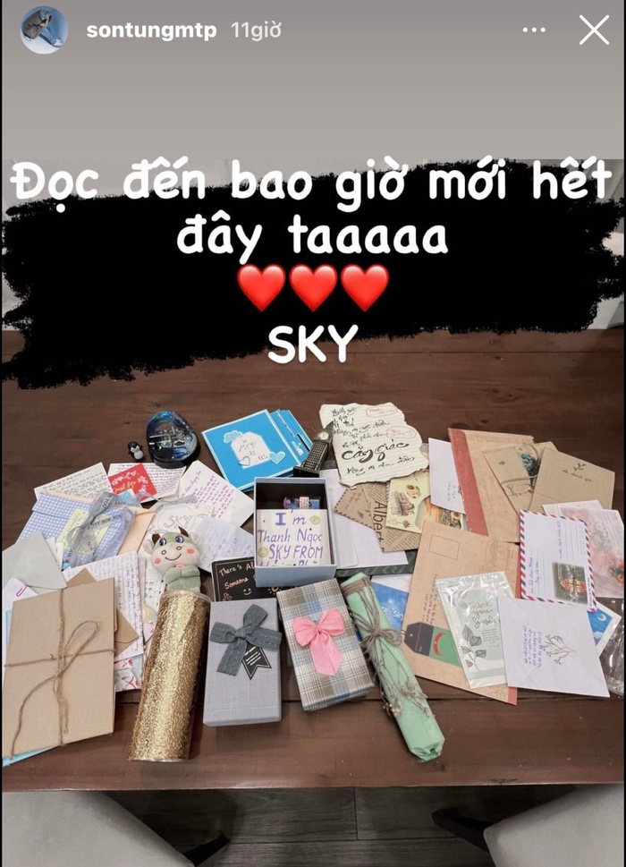 Trên Instagram, Sơn Tùng đăng tải dòng trạng thái: "Đọc đến bao giờ mới hết đây ta" kèm với biểu tượng trái tim. Có thể thấy, nam ca sĩ được fan ưu ái tặng cho nhiều quà cùng những bức thư tay đầy tình cảm. Giọng ca gốc Thái Bình thầm gửi lời cảm ơn đến khán giả của mình.