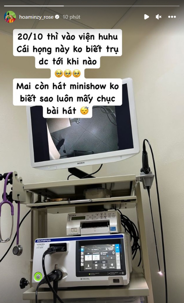 Trước đó vài ngày, giọng ca gốc Bắc Ninh cũng từng chia sẻ gặp vấn đề sức khoẻ liên quan tới cổ họng, phải nhập viện nhanh chóng để điều trị. Hoà Minzy bày tỏ sự lo lắng vì show biểu diễn chuẩn bị diễn ra.