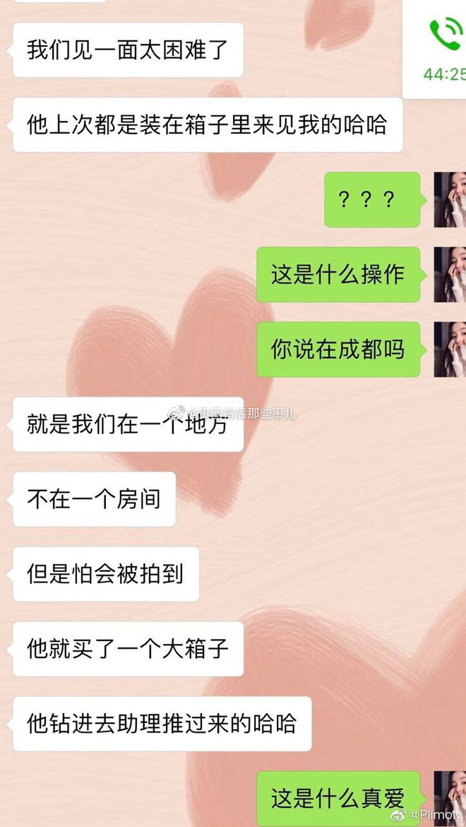 Tin nhắn cũng cho biết mối quan hệ lén lút của 2 người rất khó khăn. Cặp đôi gặp nhau rất ít, thậm chí, Phùng Thiệu Phong còn phải chui vào vali mới có thể ra ngoài "hú hí" với tiểu tam. Trong tin nhắn, cô gái này viết: "Bọn tớ không ở chung phòng, sợ bị chụp được lắm. Anh ấy mua 1 cái vali rất to rồi chui vào đó, trợ lý đẩy vali tới chỗ tớ haha". Trong tin nhắn, người đàn ông được cho là tài tử họ Phùng còn lên tiếng chê bai cuộc sống hôn nhân quá nhàm chán và gò bó.