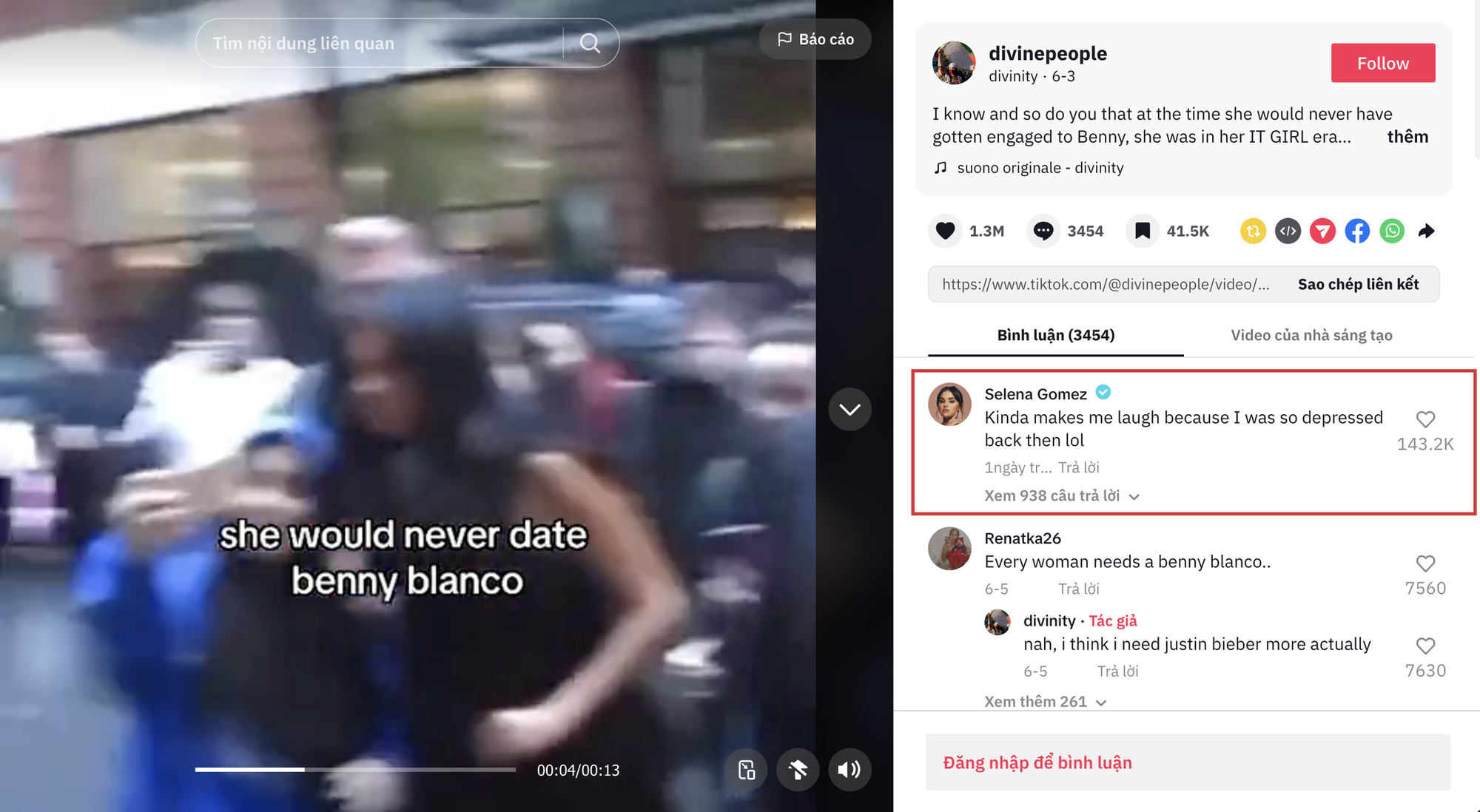 Ngày 29/7, Selena Gomez bị cho là tự tạo drama bằng cách kéo cả bạn trai hiện tại Benny Blanco, tình cũ Justin Bieber vào cuộc. Đoạn video vốn có nội dung "cà khịa" nhà sản xuất giàu có Benny và nâng tầm nữ ca sĩ Lose You To Love Me: "Cả tôi và các bạn đều hiểu rõ rằng, hồi còn là IT Girl, Selena chắc chẳng thèm đính hôn với Benny đâu". Sở dĩ Benny thường xuyên bị fan của Selena chê bai là vì ngoại hình của anh không tương xứng với bạn gái và đây cũng không phải là chủ đề mới mẻ. Nhưng nữ ca sĩ lần này đột nhiên muốn lên tiếng để bênh vực bạn trai, còn tìm đến clip TikTok được đăng tải từ 4 tháng trước để bình luận: "Clip này buồn cười thật đấy, vì cơ bản là hồi đó tôi bị trầm cảm dữ lắm". Đáng chú ý, nhạc nền của video này là bài hát Company của Justin.